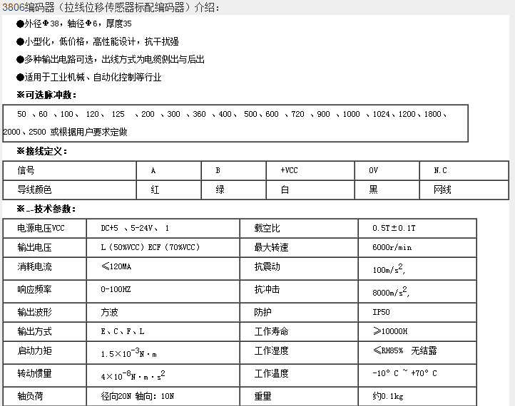 3806電梯位移編碼器把角位移或直線位移轉(zhuǎn)換成電信號(hào),前者稱為碼盤,后者稱為碼尺。按照讀出方式編碼器可以分為接觸式和非接觸式兩種;按照工作原理編碼器可分為增量式和絕對(duì)式兩類。增量式編碼器是將位移轉(zhuǎn)換成周期性的電信號(hào),再把這個(gè)電信號(hào)轉(zhuǎn)變成計(jì)數(shù)脈沖,用脈沖的個(gè)數(shù)表示位移的大小。絕對(duì)式編碼器的每一個(gè)位置對(duì)應(yīng)一個(gè)確定的數(shù)字碼,因此它的示值只與測(cè)量的起始和終止位置有關(guān),而與測(cè)量的中間過程無關(guān)。